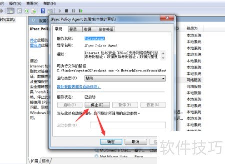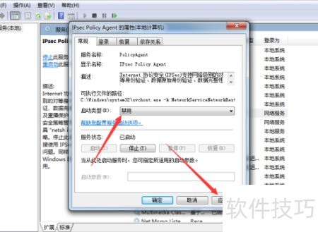 5、 在IPsec Policy Agent属性窗口中,将启动类型设为禁用,然后点击应用按钮确认设置,具体操作所示。
