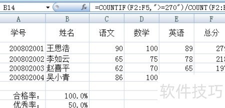 5、 利用COUNT和COUNTIF函数统计合格率、优良率等数据。
