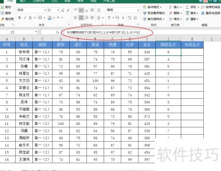 5、 在班级名称的输入框内键入公式{=SUMPRODUCT(IF(BJ=C2,1,0)*IF(ZF>I2,1,0))+1},然后按下组合键,将其作为数组公式确认。之后只需将该单元格的公式向下复制到其他单元格,即可自动完成相应数据的填充与计算,操作简便且高效。