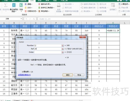 6、 该公式通过嵌套SUMPRODUCT与IF函数实现:利用IF(BJ=C2,1,0)筛选出同一班级的考生,再用IF(ZF>I3,1,0)判断同班中成绩高于指定考生的人数,最后由SUMPRODUCT统计满足条件的数量,从而得出该考生在班级中的排名位置。