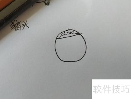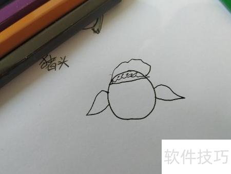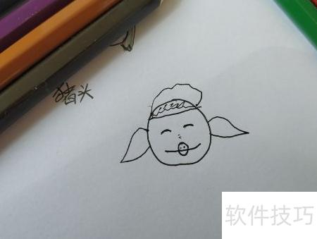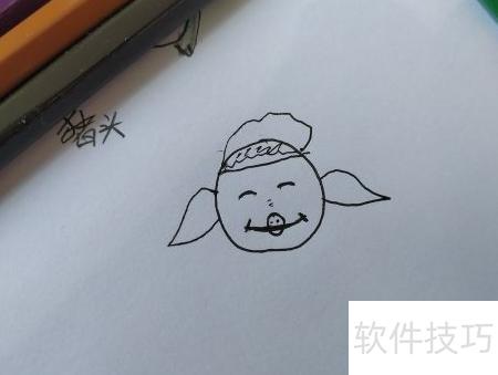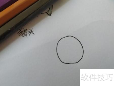 1、 用硬币画圆,再在圆上加个小点代表猪头即可。