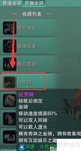 6、 在奇趣坐骑中选择心仪的红罗舸即可骑乘。
