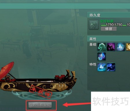 7、 选中红罗舸后,点击其下方设为当前坐骑按钮,即可激活骑御技能,在水中畅行无阻地驾驭红罗舸。