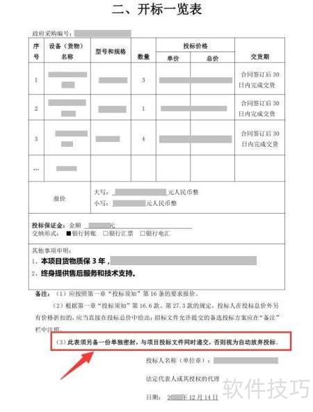 6、 正确填写投标报价后,需留意下方备注要求,另准备一份单独密封的文件。
