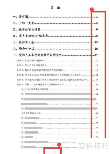 7、 编制完商务标书后,添加页码(1所示),并同步更新目录页码,最终完成标书。