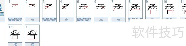 2、 叠字书写顺序:先写三个又的变形,再写田部,最后收笔于下方横画。