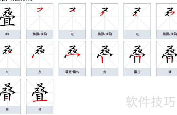 6、 叠字拼音为dié,部首是又,共十三画,繁体同形,五笔编码为CCCG。