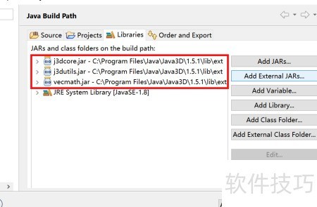 9、 在项目中通过添加外部JAR文件的方式,将Java3D的ext目录下的所有JAR包全部导入即可。