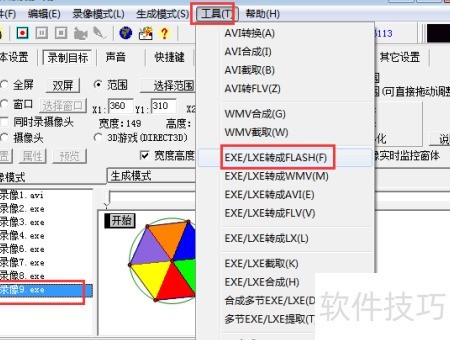 5、 第二步操作是将已录制的视频转换为swf格式。屏幕录像专家自带转换功能,可生成swf动画,但不支持直接转为gif。找到刚录好的录像9,点击工具菜单,选择其中的EXE转Flash功能即可完成格式转换。此过程简便快捷,适合快速导出动画文件。