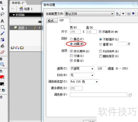 9、 处理完成后需导出为GIF格式。点击文件菜单中的发布设置,在格式选项中仅选择GIF,于右侧输入文件名,再通过浏览按钮选定桌面作为保存位置即可。
