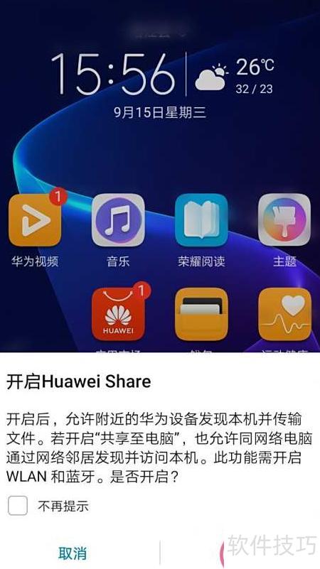 5、 随后会出现启用Huawei Share的提示,点击开启即可。