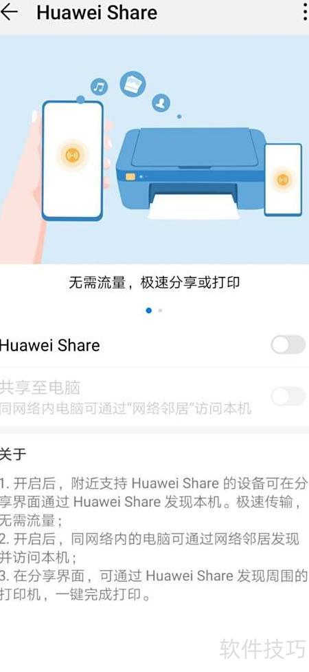 3、 进入华为分享界面,仔细阅读相关内容后,将右侧开关向右滑动即可开启功能。