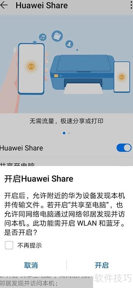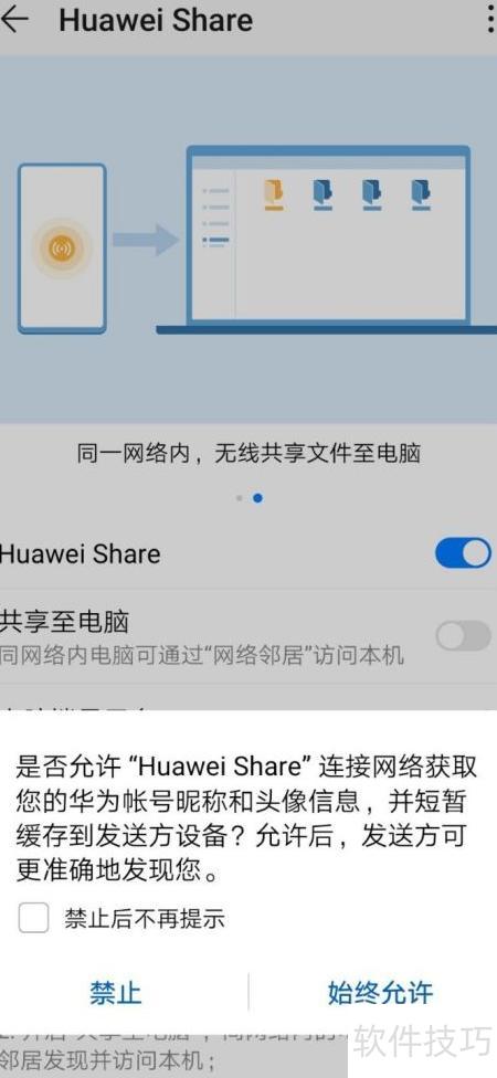 5、 开启后会出现提示框,仔细阅读内容,然后点击右下角的始终选项,确认后即可成功启用华为分享功能。