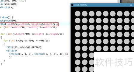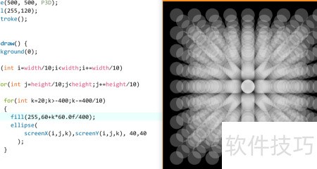 5、 通过screenX(x,y,z)和screenY(x,y,z)将三维坐标转换为屏幕上的二维位置,结合ellipse函数进行绘制,利用坐标变换实现立体感的阵列图形效果,呈现出空间分布的视觉层次。