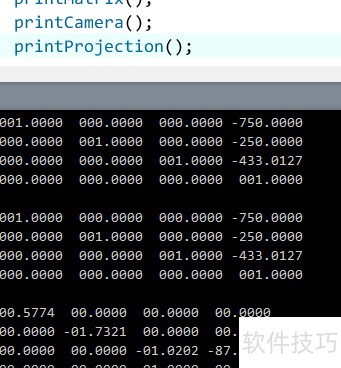 10、 通过调用printMatrix、printCamera和printProjection函数,可分别获取模型视图矩阵、摄像机矩阵和投影矩阵的各项数值。
