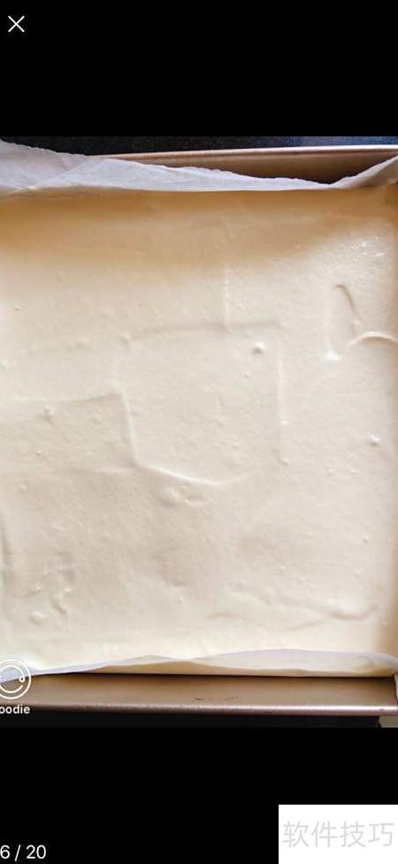 6、 将调好的面糊倒入烤盘,刮平表面并轻震以去除气泡。