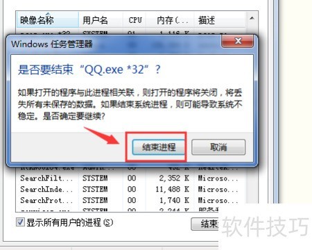 4、 找到QQ程序并结束其运行进程。