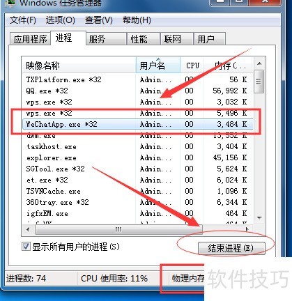 6、 在进程列表中选中目标软件,点击结束进程即可终止运行。