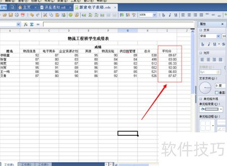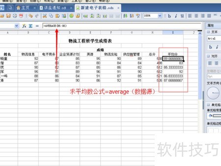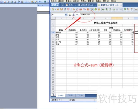 6、 第二步,通过函数公式计算总分与平均分,所示。