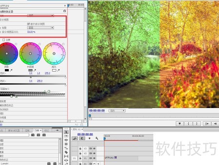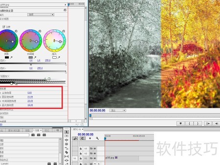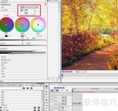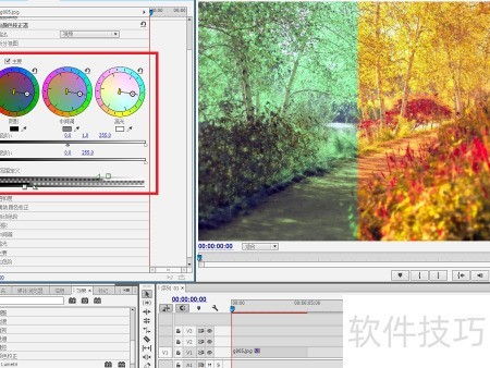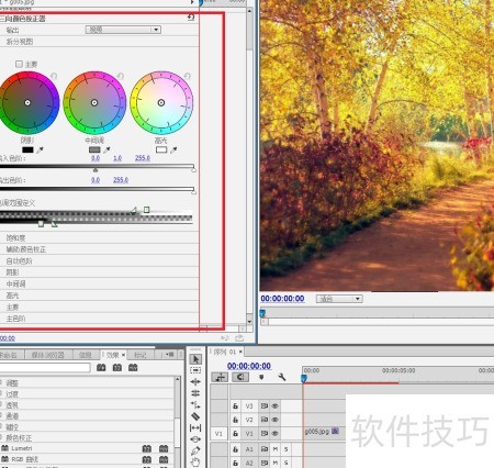 使用Premiere三向颜色校正工具,精细调节画面色彩、灰度及高光区域。