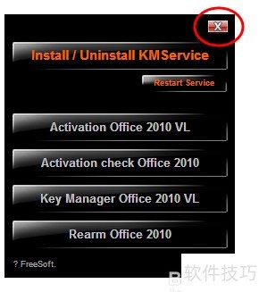3、 数秒后将弹出全英文的软件激活界面,无需担心语言问题,按步骤操作即可。点击Install/Uninstall KMService按钮,系统会启动命令提示符窗口,此时在键盘输入字母Y(不区分大小写)确认操作。