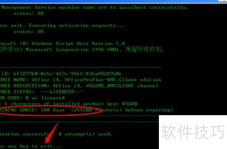 6、 命令行在CMD窗口运行约一分钟后,若底部显示,即表示激活成功,有效期为180天。到期后系统仍会提示重新激活。建议用户尊重软件版权,条件允许时尽量使用正版,支持正版软件的健康发展。