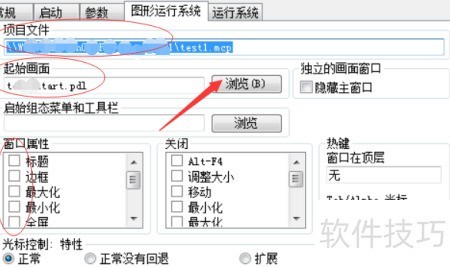 5、 在图形运行系统中,于项目文件栏输入需启动项目的路径,通过起始画面点击浏览选择初始画面,并在窗口属性中勾选调整大小等工具选项。