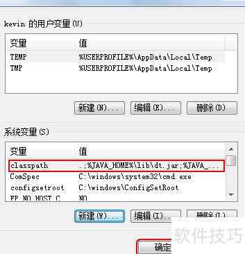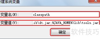 9、 在变量名(N)处填写 classpath,在变量值(V)中输入 %JAVA_HOME%libdt.jar;%JAVA_HOME%lib ools.jar,完成后点击确定按钮保存设置。
