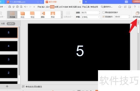 9、 点击应用到全部即可为所有幻灯片添加此动画效果。