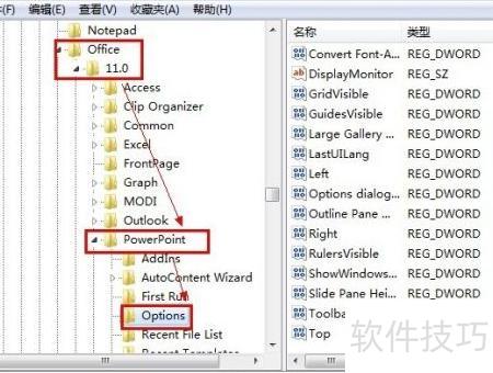 4、 在注册表中依次展开以下路径:HKEY_CURRENT_USERSoftwareOffice11.0PowerPointOptions。其中,版本号11.0对应PowerPoint 2003,而14.0则对应PowerPoint 2010。根据所使用的软件版本,选择对应的文件夹进行查看或修改操作。该路径常用于调整PowerPoint的相关设置参数。