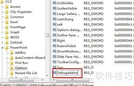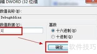 7、 双击新建的DebugAddins,对话框中将数值数据设为1,确认后关闭注册表编辑器即可。