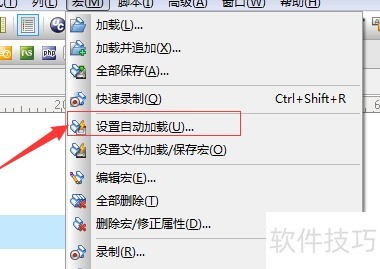3、 点击宏菜单后,下拉选项中选择设置自动加载即可。
