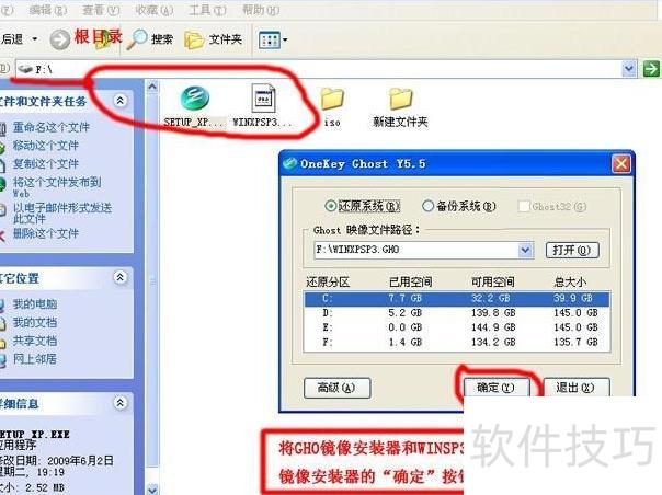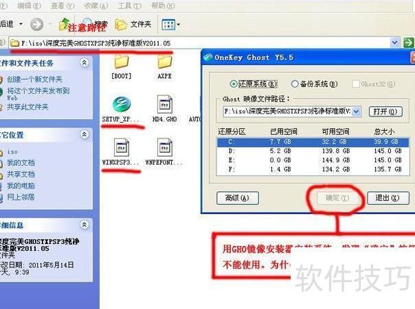 4、 你是否发现安装路径显示为F:iso深度完美GHOSTXPSP3纯净标准版V2011.05时,点击确定无反应?这个问题十分常见。解决方法很简单:只需将SETUP_XP.EXE(硬盘安装工具)和WINDOWS.GHO镜像文件复制到F盘的根目录下即可顺利进行安装。操作完成后,通常就能正常启动安装程序,避免因路径过深或特殊字符导致的识别异常。获取最新系统版本,请访问官方下载站点:http://xt.xpxitong.net/