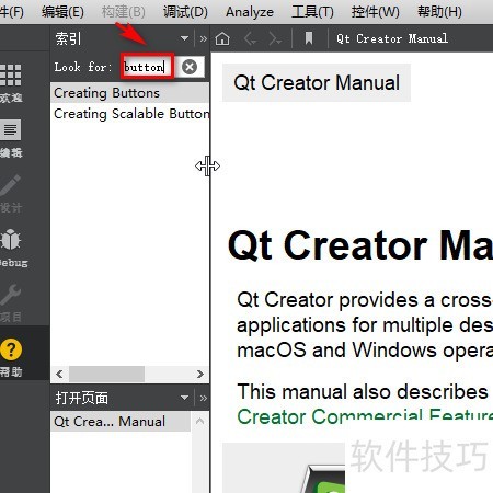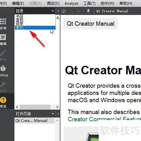 启动Qt Creator后,进入帮助菜单,选择索引功能,输入关键词进行搜索,即可查看详细操作步骤。