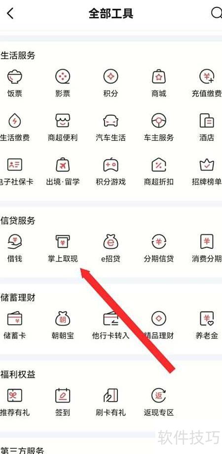 3、 进入全部工具页面,点击掌上取现功能即可操作。