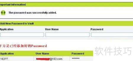 8、 点击添加密码保存信息,下方随即显示已存储的用户名与密码,具体效果所示。