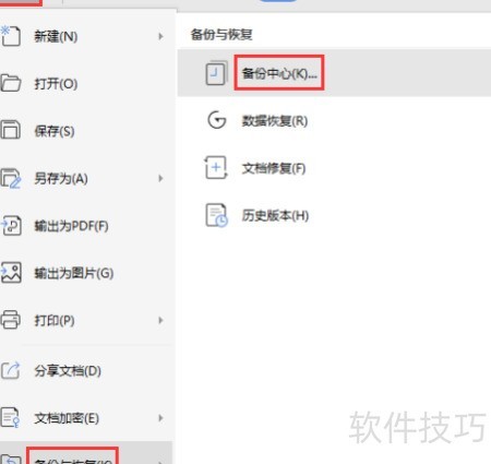 1、 打开任意Office文档,以Word为例,双击启动后点击左上角文件选项,依次选择备份与恢复中的备份中心即可进入相关设置界面。