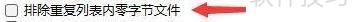 4、 在弹出的窗口中,勾选排除重复列表中的零字节文件选项。