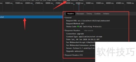 4、 切换至右侧Messages面板,可查看上下行的WebSocket数据包。