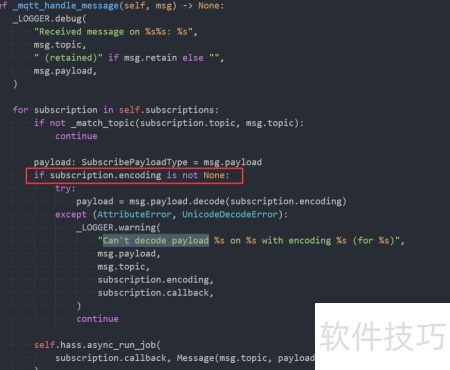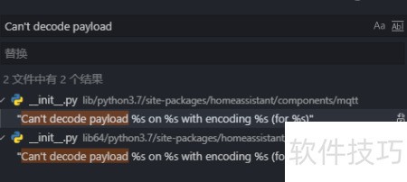 3、 在Home Assistant的程序包目录中,查找包含cant decode payload内容的文件,可找到对应路径为homeassistant/components/mqtt/__init__.py。