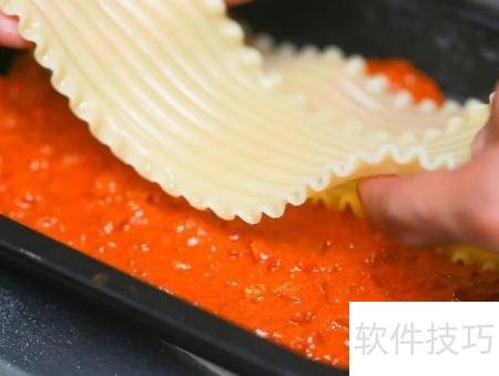 20、 将面片整齐铺在烤盘底部,确保完全覆盖。每层可竖放三张千层面皮,彼此轻微重叠,重叠宽度不超过2.5厘米。若超出此范围,可用干净剪刀修剪边缘,保证整体平整贴合,不留空隙。