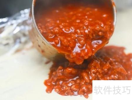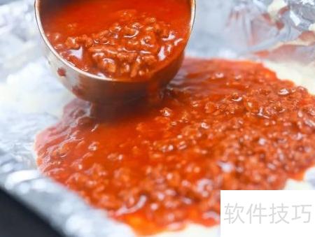 19、 选用可放入烤箱的大容器,建议尺寸约为33厘米×23厘米×5厘米或容量2升的烤盘。将肉酱均匀铺满底部,确保覆盖完整。