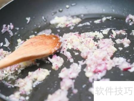 5、 将白洋葱丁和两瓣蒜末放入锅中翻炒2至3分钟,待洋葱边缘呈半透明状、略显晶莹即可,无需完全炒熟。