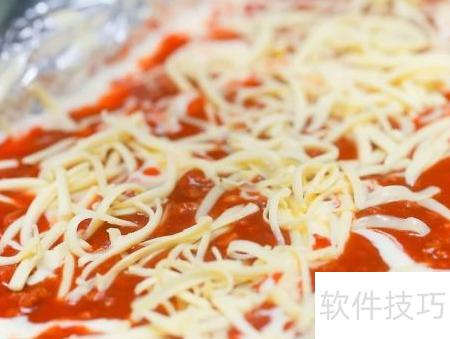 23、 在肉酱表面均匀铺上厚厚一层马苏里拉奶酪,直至几乎完全覆盖,仅零星露出红色酱料,第一层面条层便完成。若追求健康,可适当减少奶酪用量。