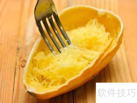44、 将面条瓜切面朝下放入烤盘,倒入2.5厘米深的水,置于230℃烤箱中烘烤45至60分钟,直至叉子能轻松插入,表明已熟透。