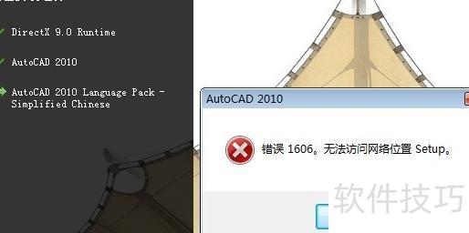 2、 安装时总出现错误1606,无法访问网络位置setup的提示,导致安装中断,即使更换CAD版本问题依旧存在。
