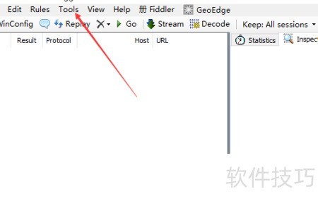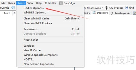 4、 点击工具菜单后,下拉列表中选择Fiddler选项即可进入设置界面。