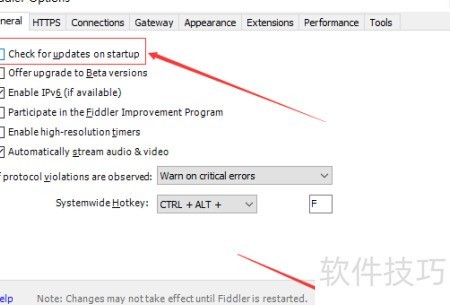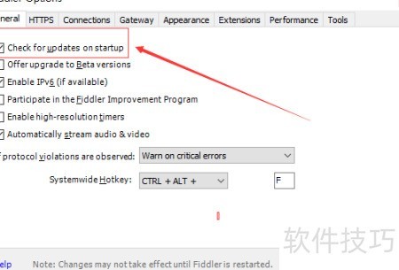 使用Fiddler时,若不想启动时自动检查更新,可进入设置界面,找到相关选项并关闭自动更新功能,具体操作步骤如下。
