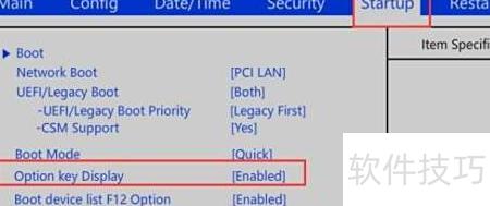 4、 部分机型需进入BIOS,选择Startup选项,找到Option Key Display并将其设为Disabled,按回车确认,最后按F10保存设置并退出即可完成操作。