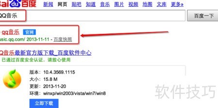 1、 在百度搜索QQ音乐时,请点击第一个结果,第二个链接是PC版,下载后无法正常使用。